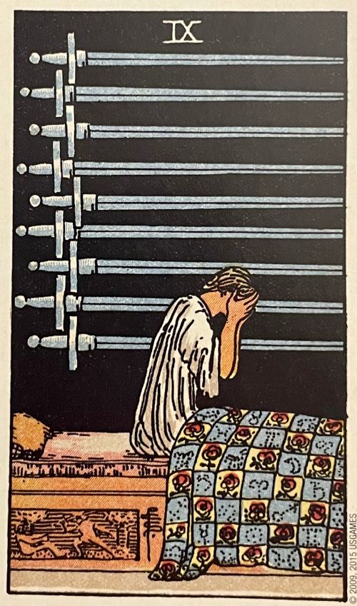 한 여인이 두 손으로 얼굴을 가린 채 침대 위에서 울고 있는 것처럼 보인다. 지금의 심정은 답답하기만 하다. 침대 위에는 가지런히 놓인 아홉 개의 검이 벽에 걸려 있지만, 그녀를 향하고 있지는 않다. 이것은 현재의 상황이 극단적인 상황까지는 가지 않음을 의미한다.